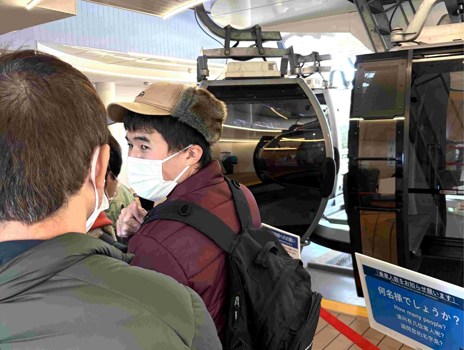 当日は9:00に当園を出発し、まずは桜木町へ向かいました。桜木町駅と運河パーク駅を片道約5分で結ぶロープウェイ「YOKOHAMA AIR CABIN」に乗車し、空中からみなとみらいの景色を楽しみました。高いところが少し苦手な方もいましたが、ガラス張りのゴンドラから見える景色に思わず笑顔がこぼれていました。