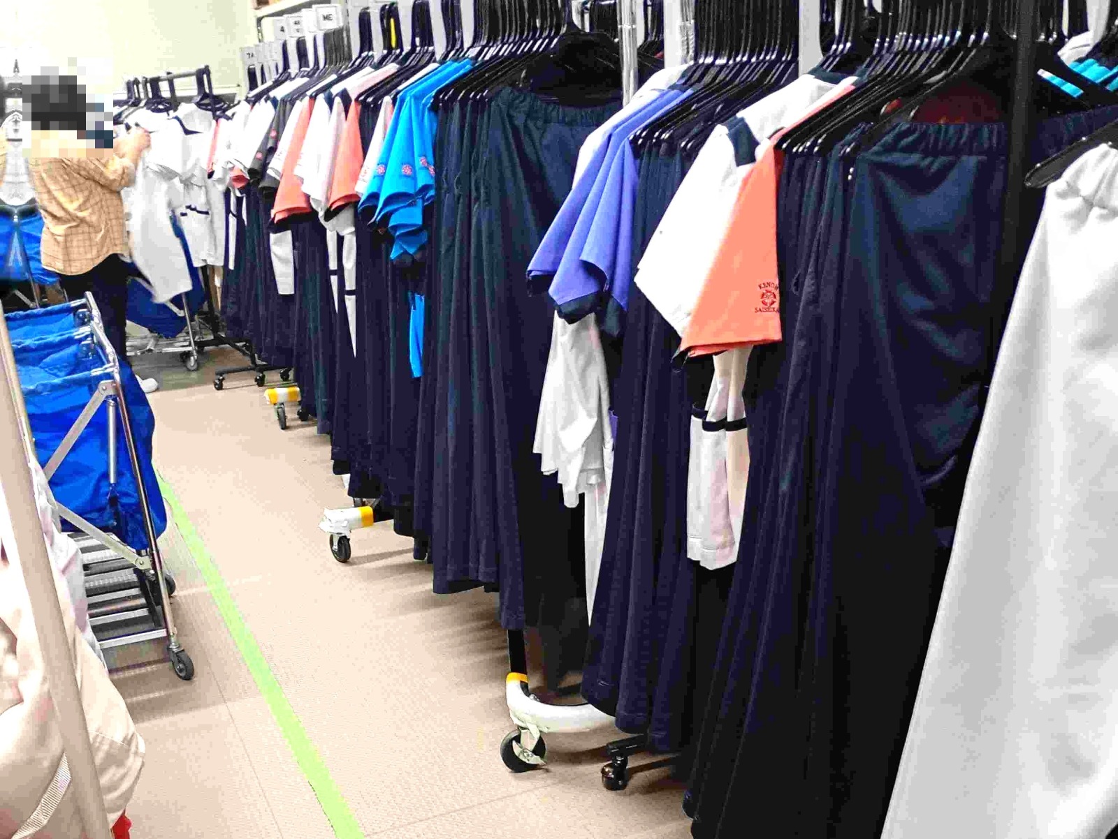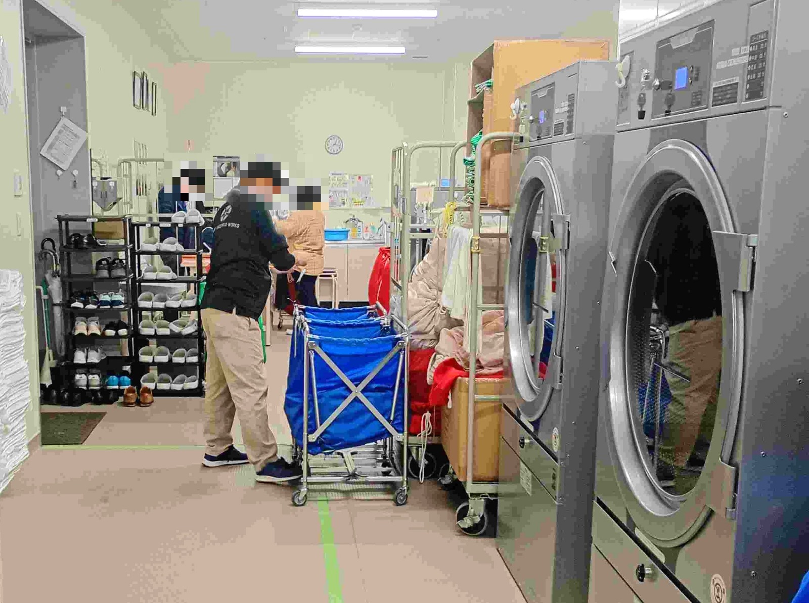 済生会新潟県央基幹病院内の事業所で特に印象的だったのは、トンネルフィニッシャーを使用せず、ユニフォームの素材選定から工夫を凝らし、ドラム乾燥機で仕上げる効率的な作業工程が構築されていた点です。作業スペースもコンパクトに設計されており、動線に沿って機器が配置されているため、利用者がスムーズに作業できる環境が整っていました。