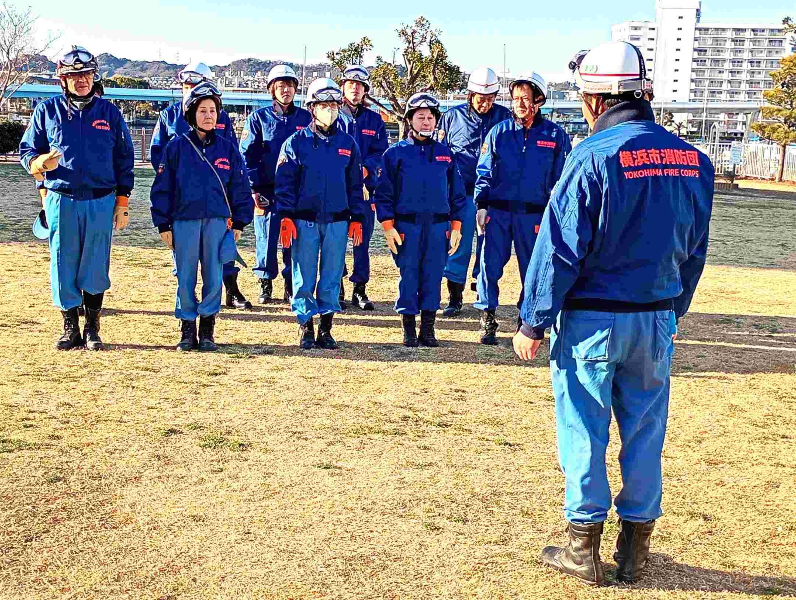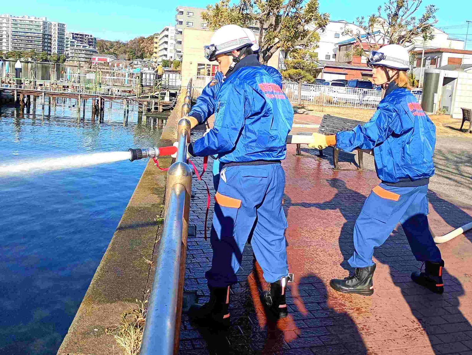 洲崎公園での訓練では、消火栓からの給水、ホースの連結、放水までの一連の動作を繰り返し訓練し、いざという時に迅速かつ確実に対応できるよう技術を磨いています。